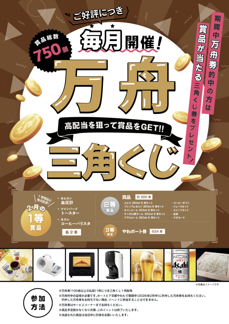 ・万舟的中の証明が必要です。期間中に的中した万舟券をお持ちください。的中した舟券をお持ちでない場合、イベントに参加できません。