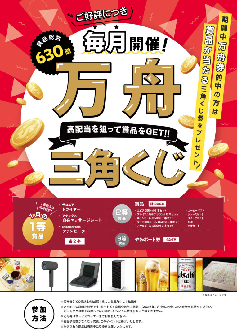 ボートピア京都やわたで買った舟券で、万舟券を当てると、さらに三角くじにチャレンジできます。万舟を当てて、さらに豪華賞品がゲットできるかも!?
