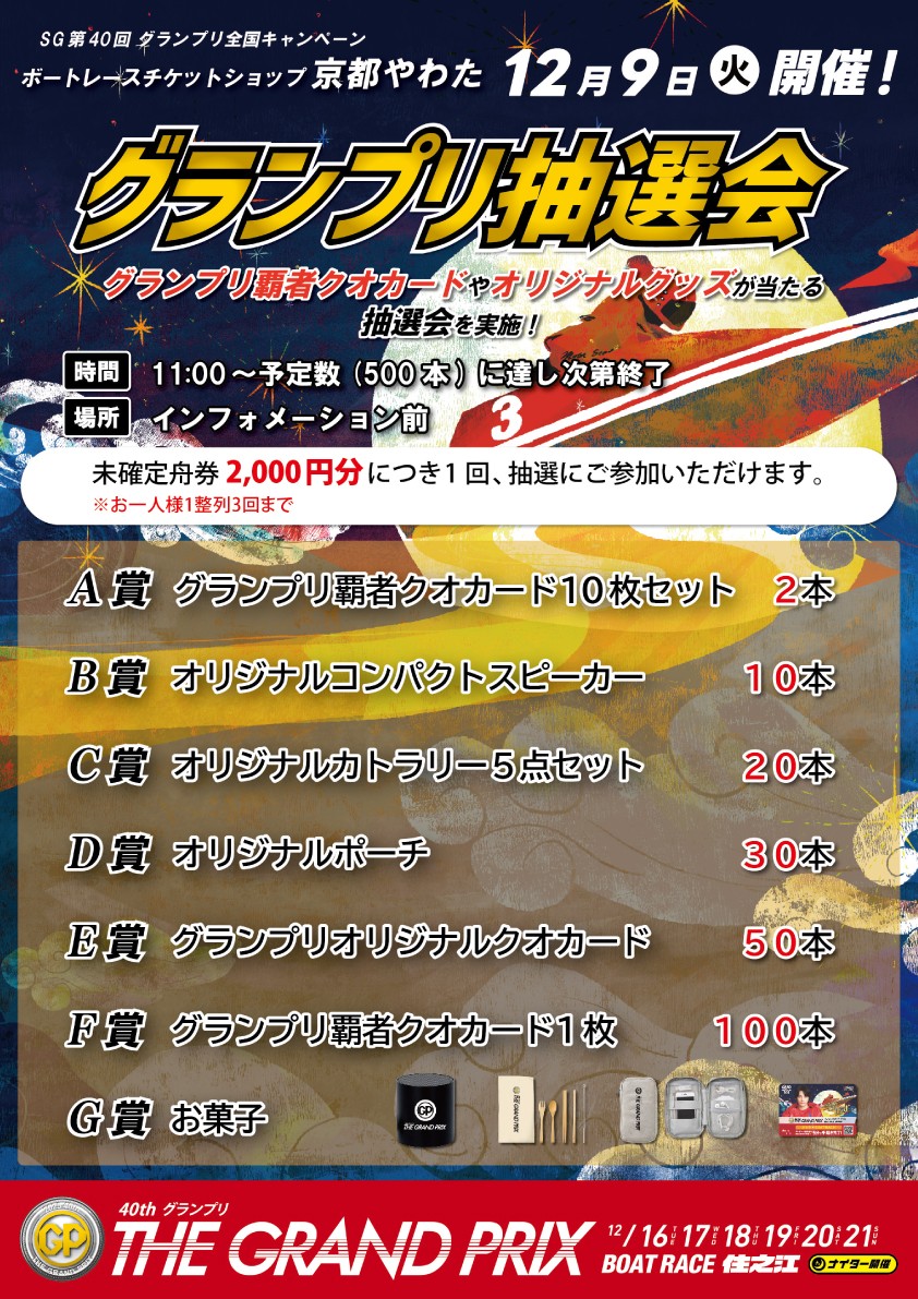 12月9日(火)、ボートレース住之江主催グランプリ抽選会を行います イベント情報2025.12.04 日時 2025年12月9日(火)11時~ 参加方法 当日発売未確定舟券2,000円分で1回参加、1名につき最大3回まで(当日ボートピア京都やわたで発売しているどの場でも可) 賞品 A賞 クオカード10枚セット 2本 B賞 コンパクトスピーカー 10本 C賞 カトラリー5点セット 20本 D賞 ポーチ 30本 E賞 クオカード 50本 F賞 クオカード 100本 G賞 お菓子