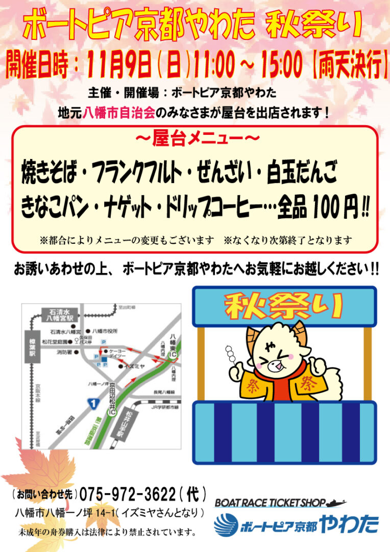11月9日(日)、ボートピア京都やわた秋祭りを開催いたします お知らせ2025.10.25 11月9日(日)、ボートピア京都やわた秋祭りを開催します。 地元・八幡市自治連合会の皆様が屋台を出店されます。 ぜひご来場ください。 開催日時 11月9日(日)11時〜15時(なくなり次第終了) 場所 ボートピア京都やわた正面入り口