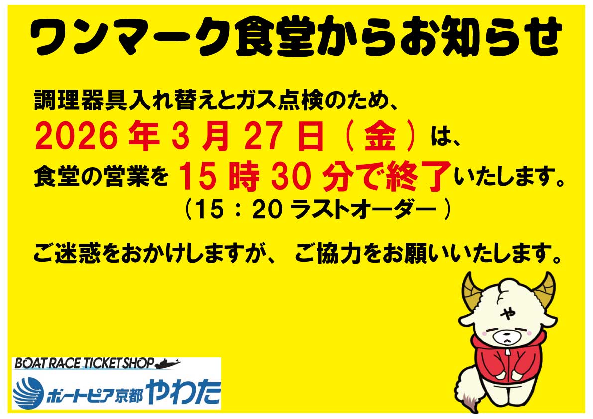 ワンマーク食堂は15時30分(15時20分ラストオーダー)で終了いたします。